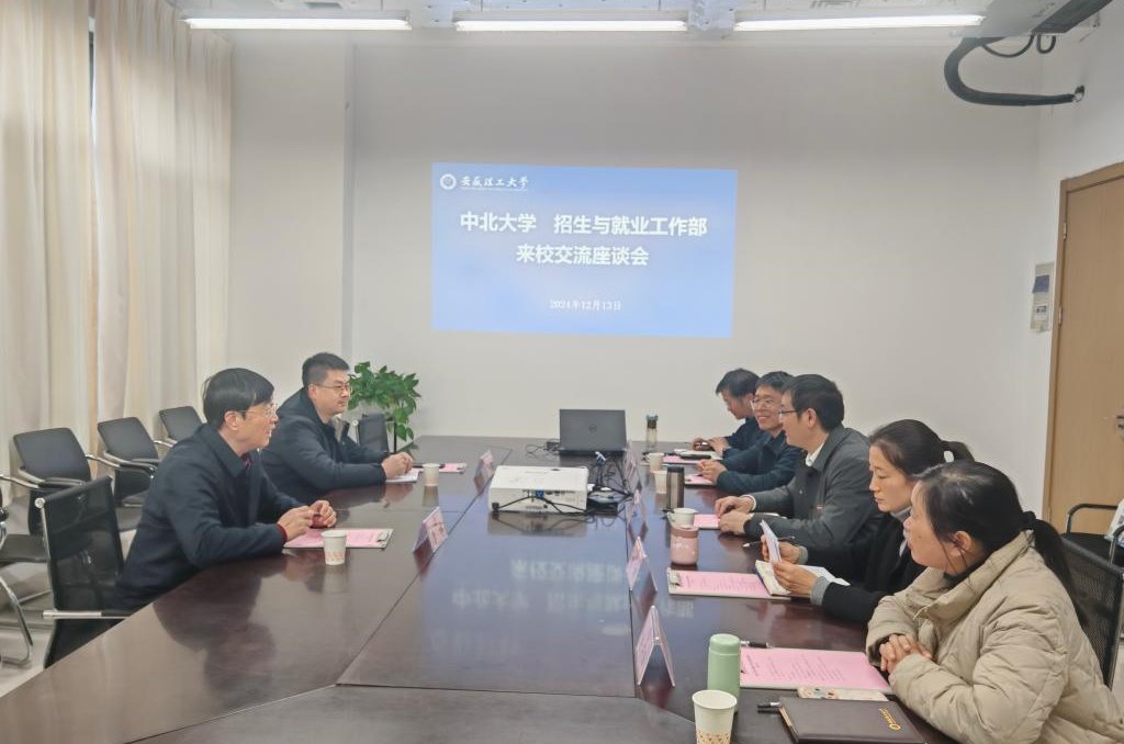 李博对学校的热情接待表示衷心感谢,对安徽理工大学在“双一流”创建和招生就业工作等方面取得的成绩表示赞赏。他介绍了中北大学招生和就业工作的基本情况,希望双方以此次交流为契机,进一步加强交流、相互启发、共同做好新高考背景下的招生工作。双方围绕新高考背景下具体招生政策制定、传统专业如何应对新高考带来的挑战、以及招生宣传的特色做法、本科转专业,学生就业创业等话题进行了深入热烈的探讨。