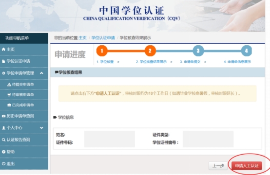 2008年之前获得学位的,需申请人工认证。进入“申请人工认证”界面,完善申请信息后提交。